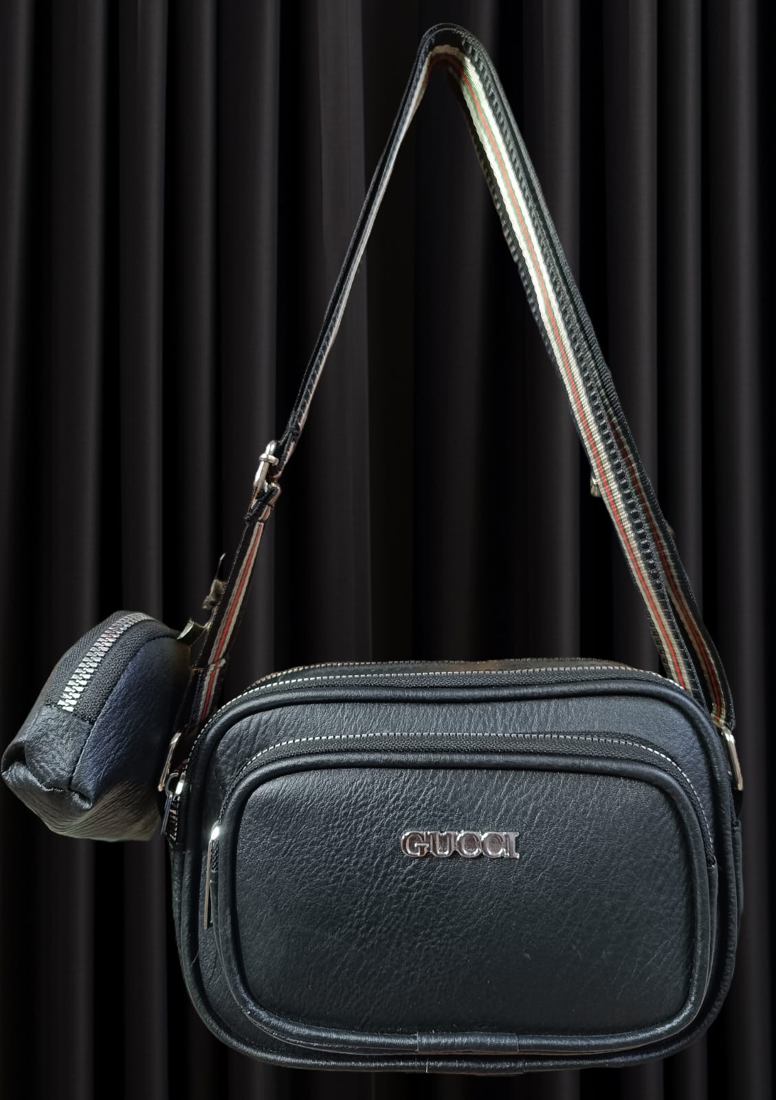 Elevate your style with the LuxeTrend Crossbody Bag, designed for fashion-forward individuals. Crafted from premium faux leather, this sleek black bag features a spacious main compartment, a front zipper pocket for easy access, and a stylish striped adjustable strap for maximum comfort. The detachable mini pouch adds extra convenience for your essentials. Perfect for casual outings or trendy streetwear looks!